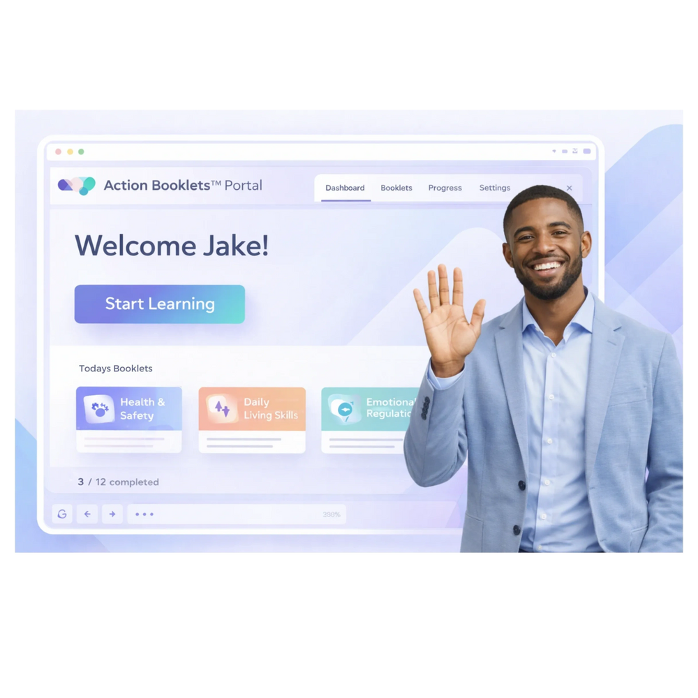 Delivered through an accessible online platform, Action Booklets™ meets people where they are, while shifting control back to the learner. Participants are able to move forward independently, pause when needed, and take ownership of their learning journey — supporting autonomy, responsibility, and independence across disability support, education, and alternative learning pathways.